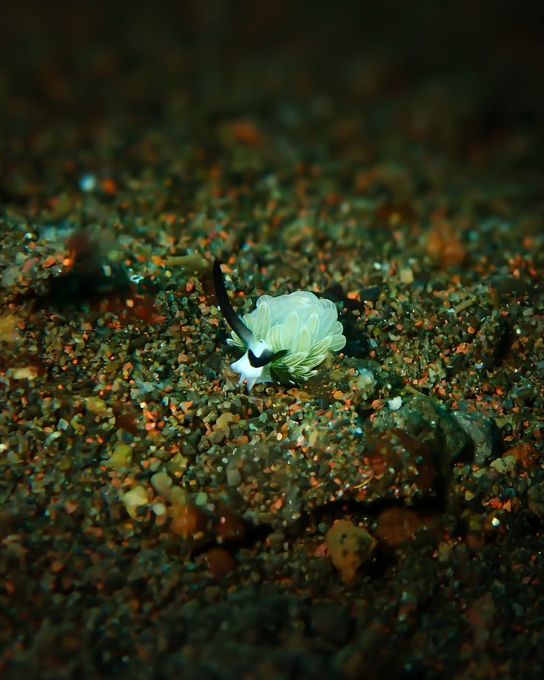 What you’re seeing right now is tiny about 5–10 mm, smaller than a grain of rice. It moves slowly and hides where its food grows on the seafloor, in coral rubble and along algae leaves. It’s a nudibranch!
